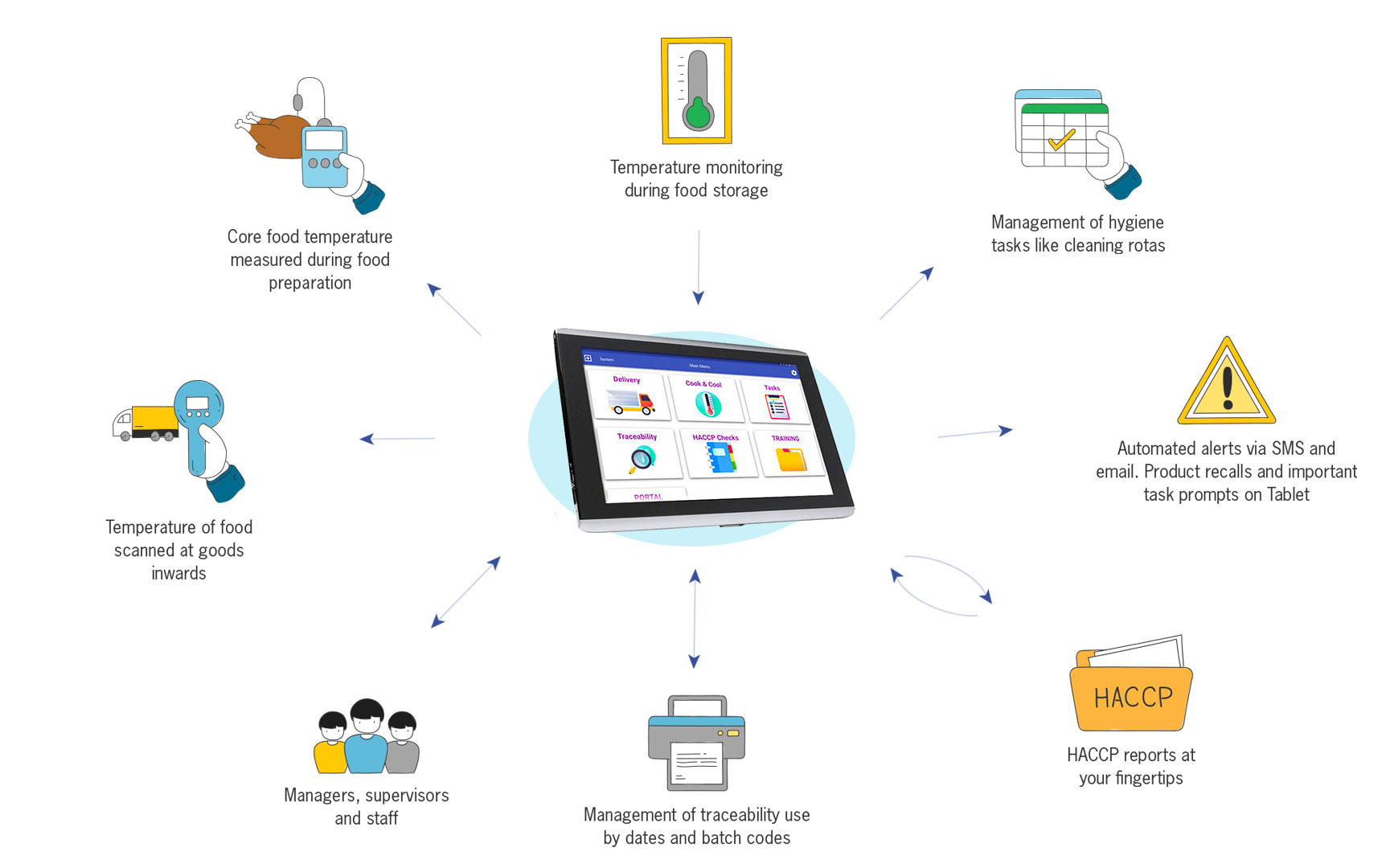 • Ensures HACCP Compliance • Delivers Complete Traceability • 24/ 7 Wireless Temperature monitoring with alerts • Shelf Life Reminders • Batch Code Management • Simplifies Auditing • Removes All Paper • Digital Task Management tracking