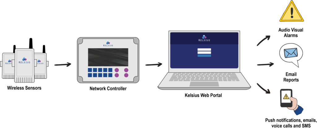 - Live and historical data available on your Kelsius Web Portal with automated PDF Reporting helps you and your team maintain quality, safety and operational efficiencies.